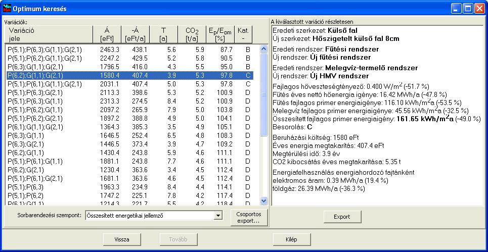 A megadott változtatási lehetőségek mellett, az összes lehetséges kombinációra elkészül az energetikai számítás.